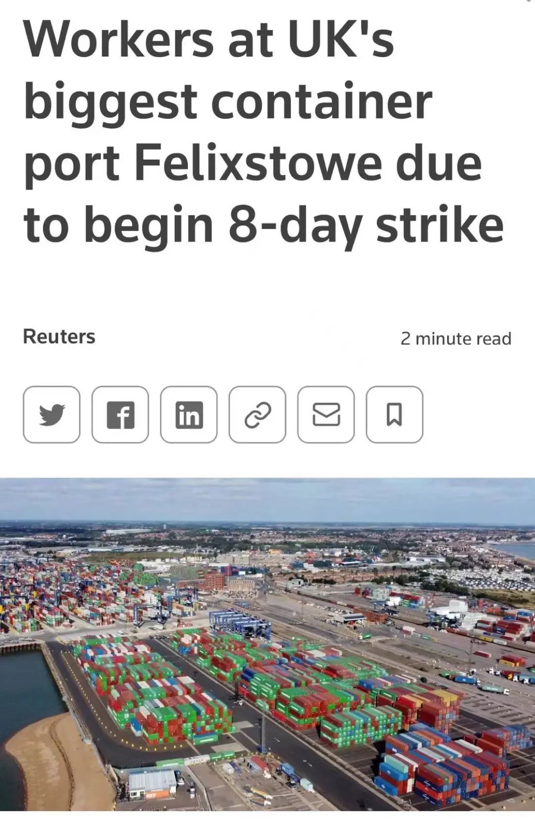 本月17日,英国通胀率突破10%关口,持续的高通胀使当地民众生活成本大幅度增加。早在7月28日,英国联合工会就曾表示,费利克斯托港的工人已经投票通过了罢工决议。但那之后资方并没有在涨薪幅度上做出让步,才导致了近日的大罢工。