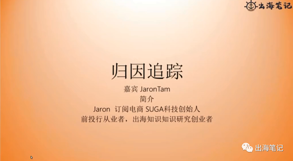 非常感谢出海笔记,今天晚上邀请我做归因追踪分享。在我打这个词的时候我发现好像归因追踪是两个词。因为它面向的东西是,如果我们在做营销转化的时候,我们可以怎么去把自己产生销售的订单和动作关联起来。