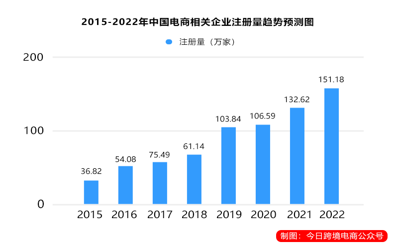 近年来我国跨境电商相关企业数量不断增加,尤其是2020年以来,企业数量大幅增加。数据显示,2020我国跨境电商相关企业数量达2957家,同比增长99.93%。2021我国跨境电商相关企业数量4727家,同比增长59.86%,预计2022年我国电商相关企业注册量将超150万家,其中广东电商相关企业最多达90.15万家。