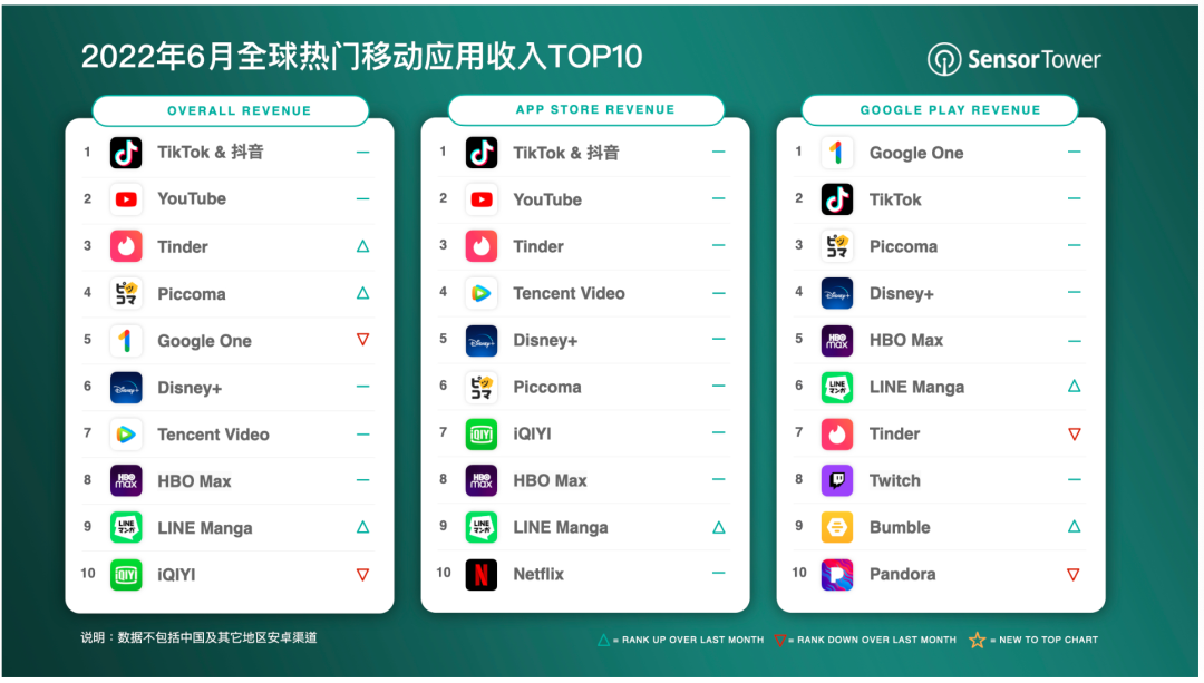 Sensor Tower最近公布了2022年6月全球热门移动应用榜单。TikTok&抖音非游戏类应用总榜单中再次蝉联冠军!