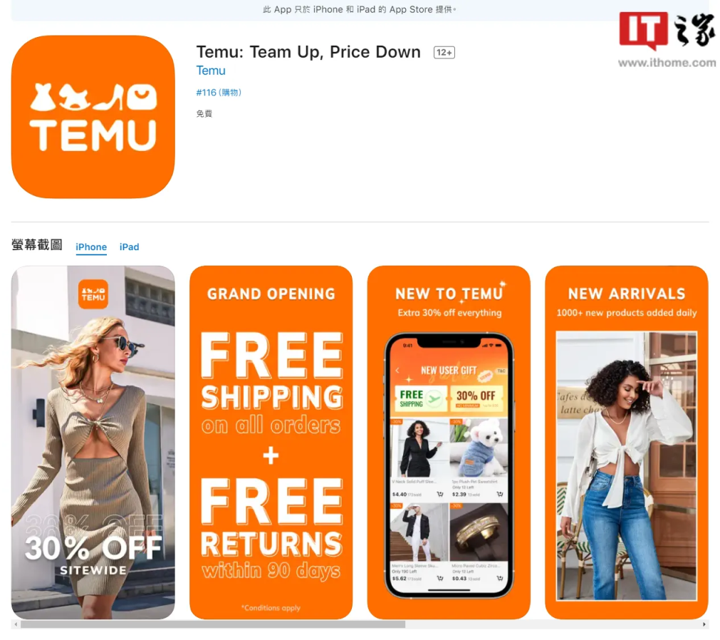 截止目前Temu在美国的苹果商店购物类APP中已排在第5位,前4名分别是:Amazon Shopping、SHEIN、Walmart以及Shop。