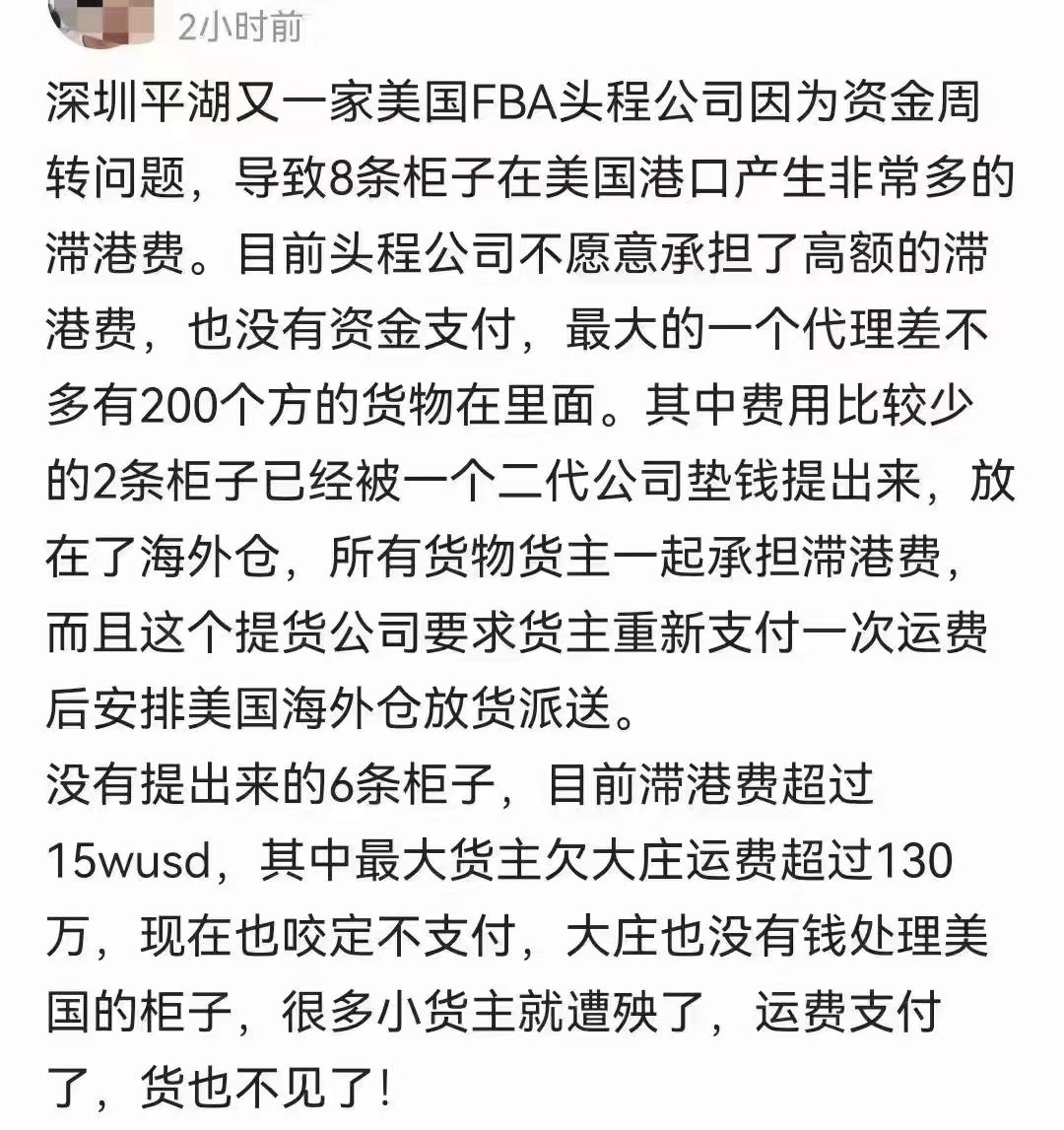 据头条号某货代爆料,深圳平湖有一家做美国FBA头程的公司因为资金周转问题,导致8条柜子在美国港口产生巨额滞港费。