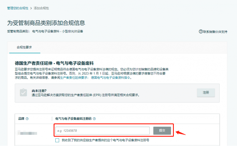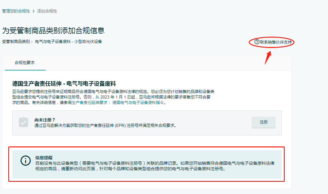 若是在上传时出现"目前没有与此设备类型关联的品牌记录"的提醒,可检查类别是否选择正确或类别和品牌是否正确注册,也可以点击右上角"联系销售伙伴"开CASE解决。