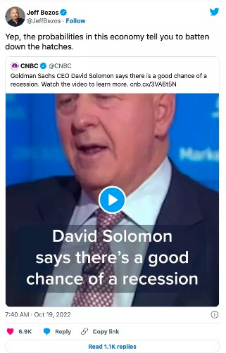 周二,贝索斯在推特转发并评论了一段高盛首席执行官大卫所罗门的视频。所罗门在视频中表示:"在结果的分布上,美国经济很有可能出现衰退,建议企业为随着增长逆风加剧而出现更多的市场波动做好准备。"