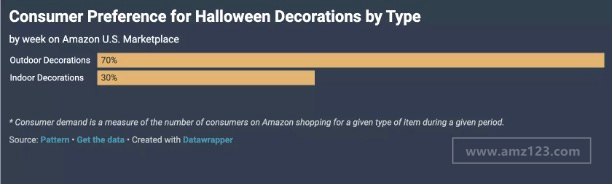 根据pattern的分析,相比室内万圣节装饰品,美国消费者对于户外万圣节装饰品有着明显地偏好,70%的消费者正在寻找户外万圣节装饰品。考虑到这一点,卖家应确保在万圣节前的几个月内备有充足的户外装饰品库存。