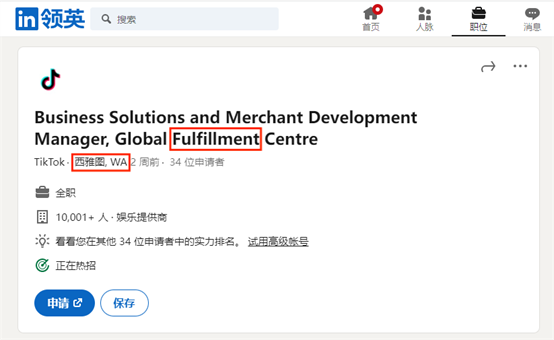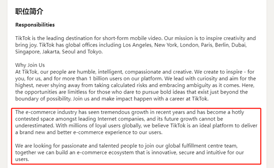 此外,在另一份招聘信息中,TikTok表示正在寻找"从零开始构建新的履行服务"并"负责美国TikTok电子商务物流履行服务的业务发展"的人。