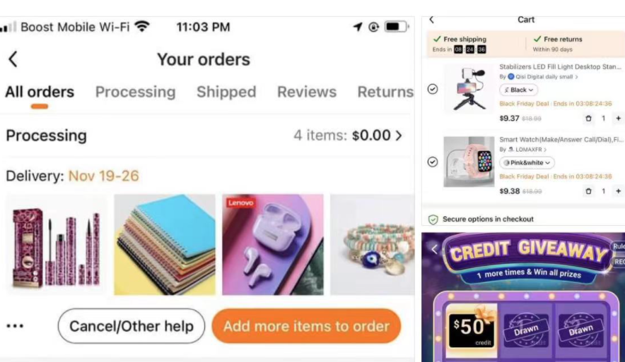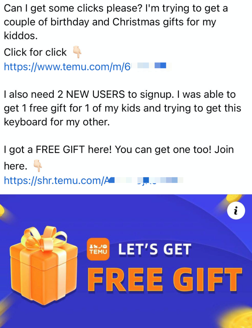 近期拼多多的海外版平台——TEMU正在各大社交媒体网站上面,进行一轮病毒式传播,用国内大家熟悉的帮忙砍一刀免费拿礼品的方式,吸引大量社媒用户转发这个文案和TEMU平台链接。