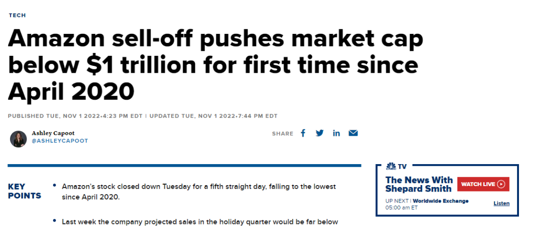 疫情之后的这两年亚马逊吃尽了疫情红利,流量和股价双丰收,着实过了两年好日子,但是今年疲态俱现,连续两个季度赤字,再加上前段时间发布的Q4预测过于悲观,亚马逊的股价短时间内一泻千里,跌回了2020年4月份的总市值。