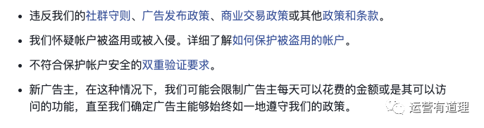 1)创建者的账号,或某个广告编辑者的广告功能受限了。