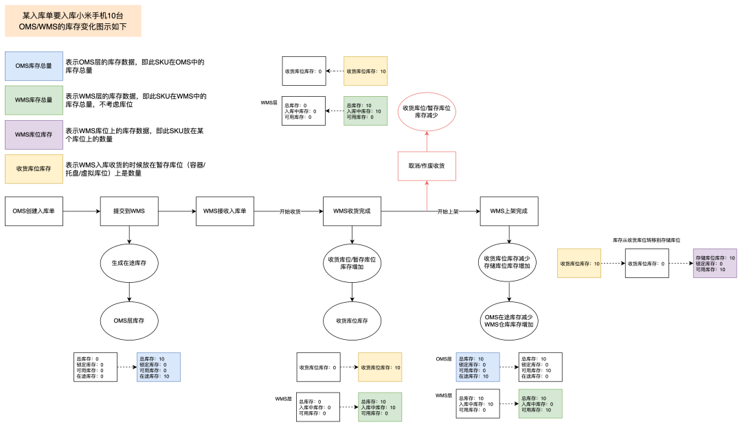 一直没花时间整理OMS/WMS相关的库存变化示意图,然后最近跟大家讲这一块业务的时候发现,还是要自己动手画个图,来的更加清晰明了,于是就有了下面的这两张图。