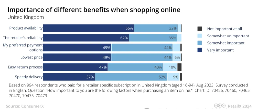 研究显示,英国消费者对于网购支付方式的选择非常看重。在被问及网购的优点中有哪些因素较为重要时,93%的消费者表示,能够使用他们喜欢的付款方式非常重要(49%)或有点重要(44%)。