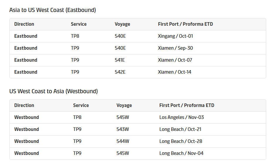 更引人关注的是,部分航线甚至直接宣布全年停航。比如马士基的美西TP9航线,在9月23日最后一班船离开厦门港后,将在2025年剩余时间内全面停航,具体恢复时间待定。