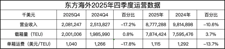在2025年第四季度,东方海外共实现营业收入20.81亿美元,同比减少17.2%;总货运量同比上升0.8%,运力同比上升4.5%。