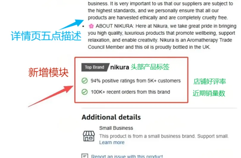 在新测试的页面布局中,这个"品牌信誉模块"占据了移动端首屏的黄金位置,优先级甚至高于A+图文详情和产品Review(评价)区域。模块内清晰展示了三大核心维度: