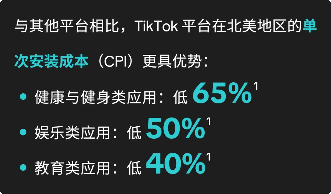 如何降低安装成本,是许多应用广告主的痛点。TikTok 平台不仅能带来高下载量,在营销成本上也更具优势,助力广告主进一步更有效地利用营销预算,节省安装成本,达成可持续的用户增长,从而帮助不同品类的应用实现降本增效。